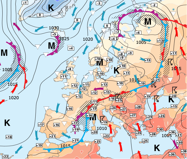 + A partir de mardi, ce courant océanique perturbé avec pluie et vent balayera la moitié Nord, puis les régions plus au Sud (excepté le domaine méditerranéen).