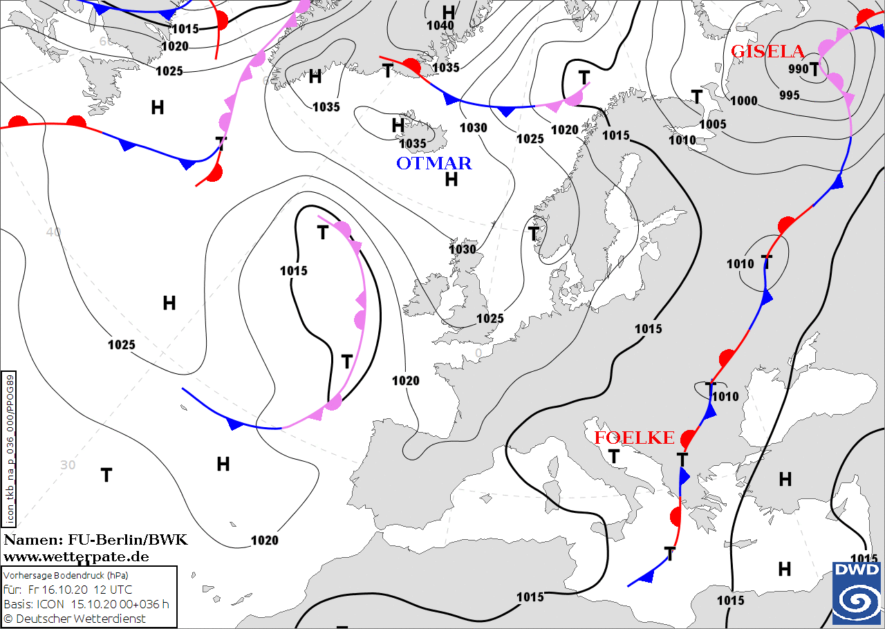 Noms des dépressions et anticyclones prévus pour vendredi 16 octobre 2020 à midi (Berlin)