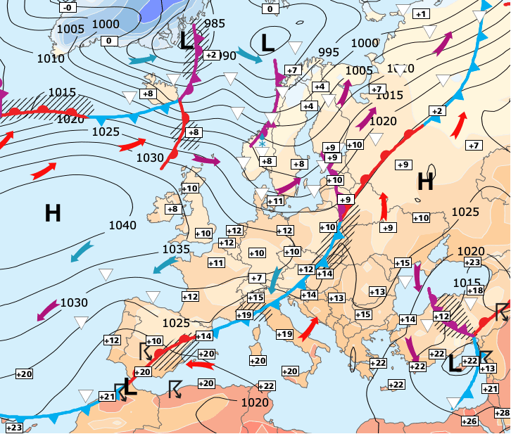 + Le centre des hautes pressions se décalera assez rapidement vers l’Europe centrale dans la journée de vendredi, et le courant s'orientera au sud (air plus doux sur les trois-quarts du pays).