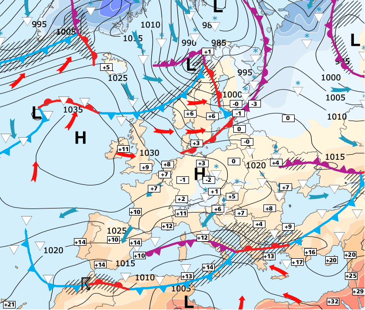 + L’influence froide, continentale mais sèche va laisser place à une influence plus maritime, toujours assez froide mais plus humide en provenance de la mer du Nord et des îles britanniques.