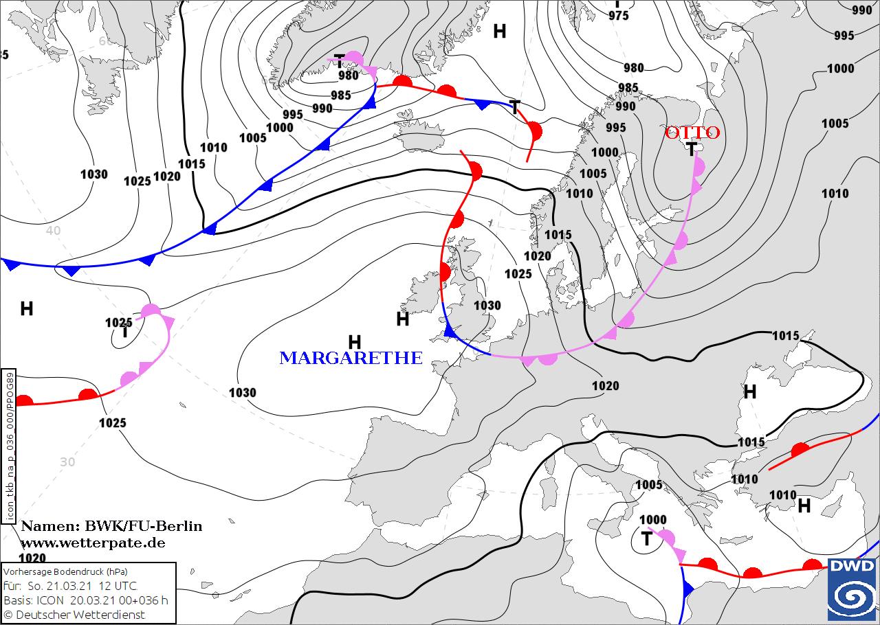 Noms des dépressions et anticyclones prévus pour dimanche 21 mars 2021 à midi (Berlin)