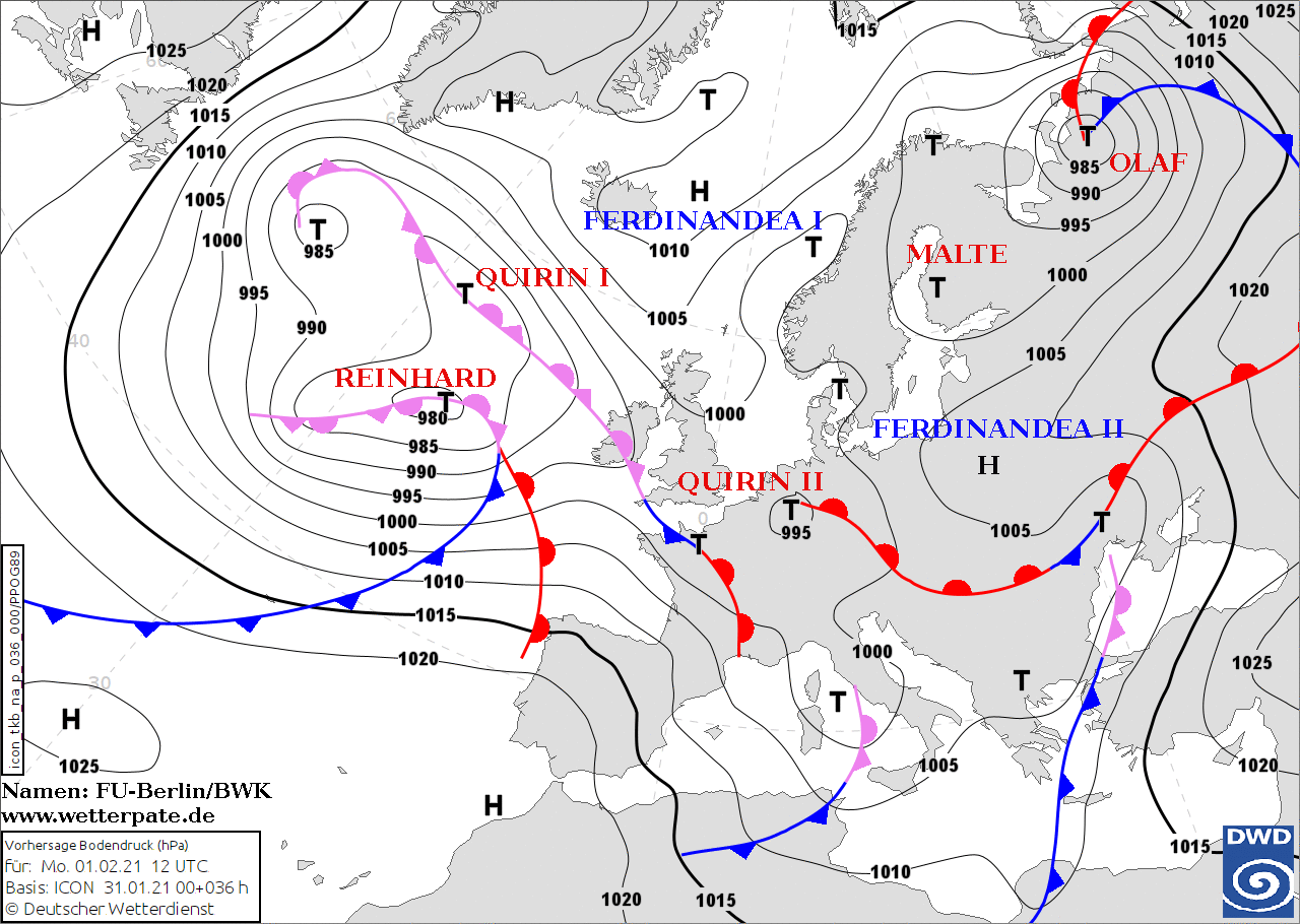 Noms des dépressions et anticyclones prévus pour lundi 1er février 2021 à midi (Berlin)