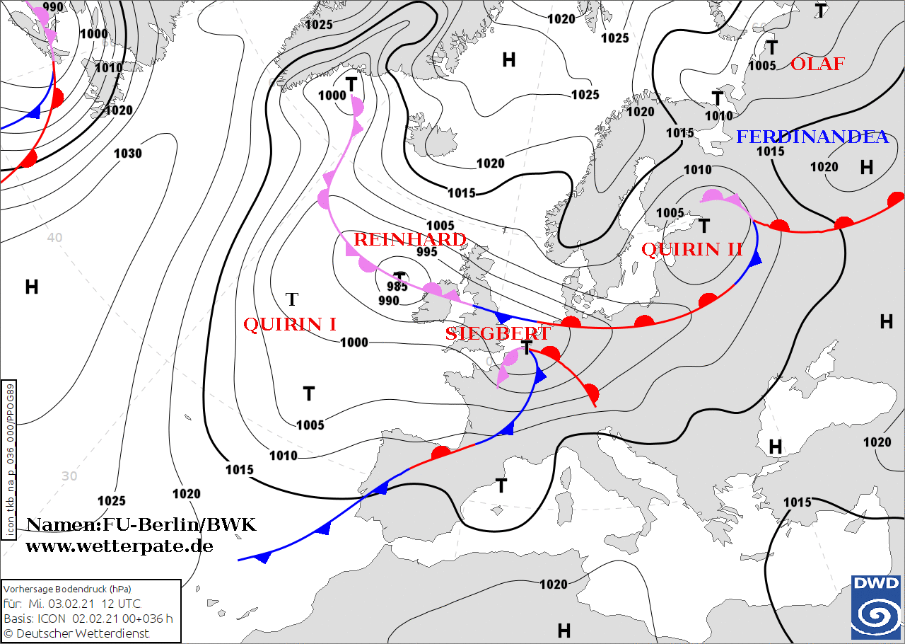 Noms des dépressions et anticyclones prévus pour mercredi 3 février 2021 à midi (Berlin)