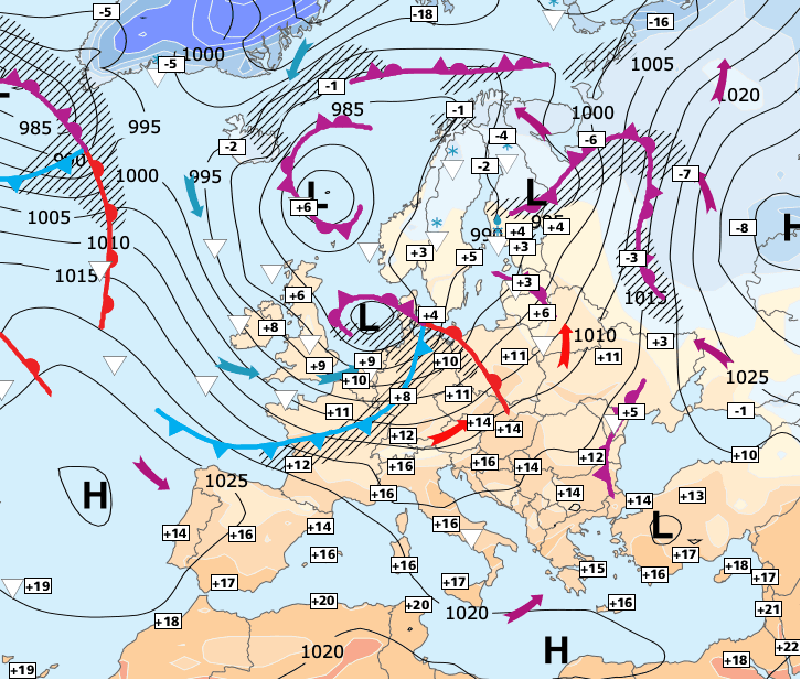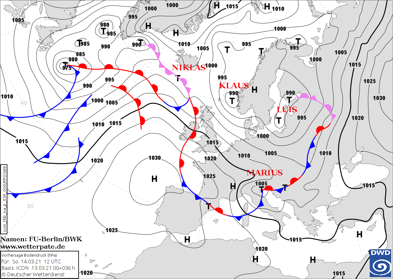 Noms des dépressions et anticyclones prévus pour dimanche 14 mars 2021 à midi (Berlin)