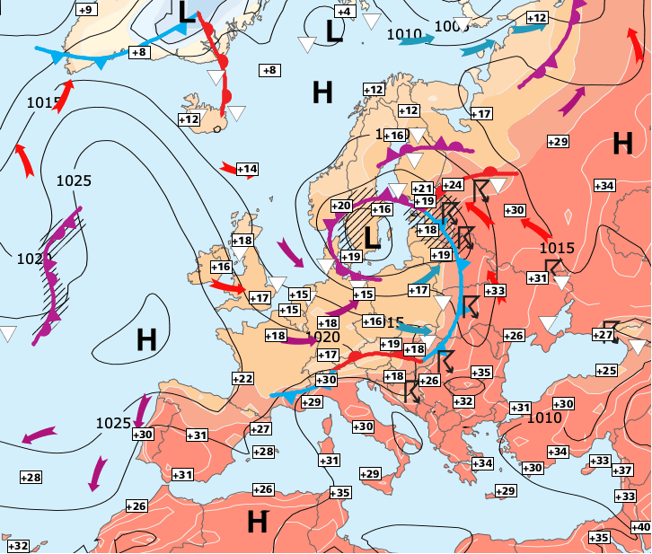 Noms des dépressions et anticyclones prévus pour mercredi 18 août 2021 à midi (Berlin)