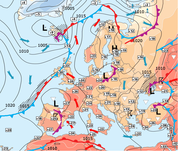 + Jeudi la tendance orageuse affectera toutes les régions du Nord et de l'Est alors que les régions de l’Ouest seront temporairement influencées par de l’air océanique plus frais.