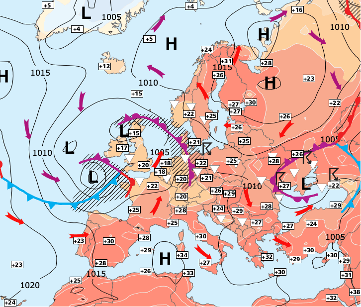 + Selon les dernières simulations, il semble que l'amélioration annoncée pour le week-end prochain soit retardée (au moins sur la moitié Nord) et que l'anticyclone des Açores ne coupera la circulation océanique humide et fraiche qu'après le 15 juillet.