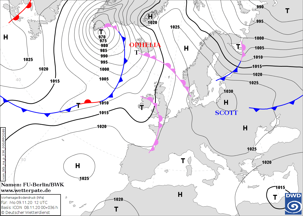 Noms des dépressions et anticyclones prévus pour lundi 9 novembre 2020 à midi (Berlin)