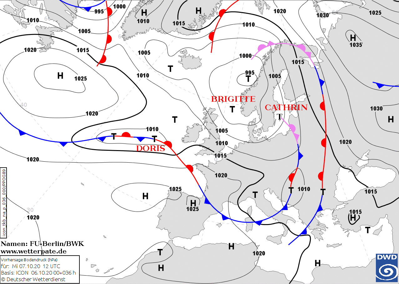Noms des dépressions et anticyclones prévus pour mercredi 7 octobre 2020 à midi (Berlin)