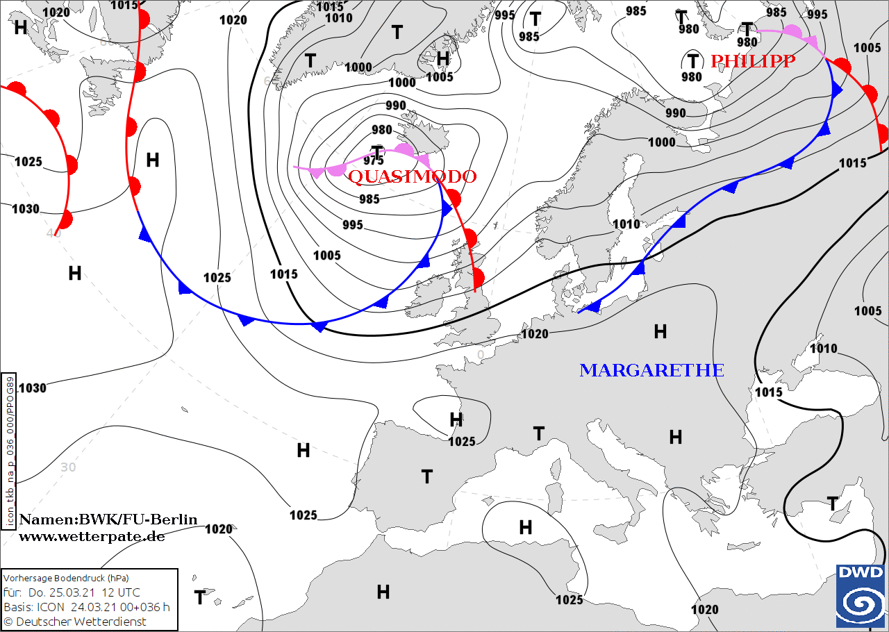 Noms des dépressions et anticyclones prévus pour jeudi 25 mars 2021 à midi (Berlin)