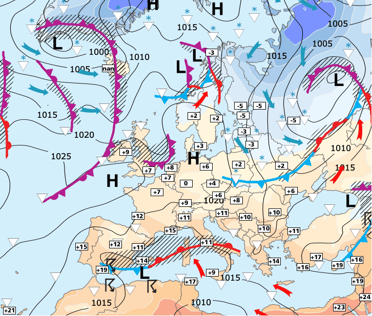 + La couche d'air froid (avec fortes gelées matinales) présente depuis quelques jours sur une grande moitié Nord va disparaitre avec le vent d'ouest.