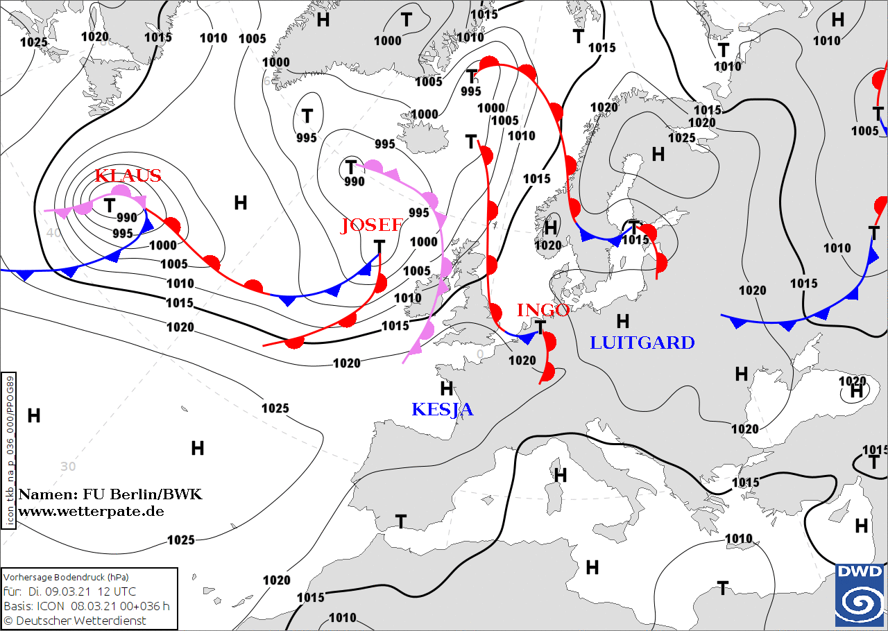 Noms des dépressions et anticyclones prévus pour mardi 9 mars 2021 à midi (Berlin)