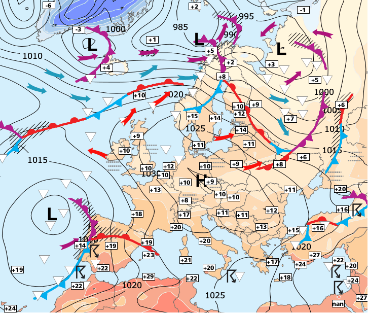 + Comme nous sommes situés dans sa partie occidentale, le courant va rapidement s’orienter au sud, et l’air très doux originaire d’Afrique du Nord remontera vers nos régions.