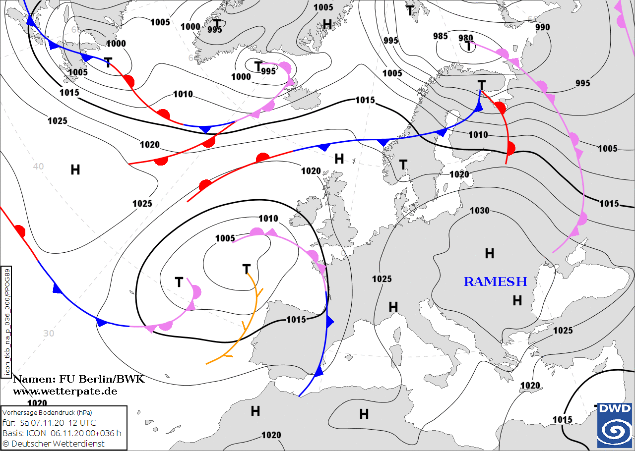 Noms des dépressions et anticyclones prévus pour samedi 7 novembre 2020 à midi (Berlin)