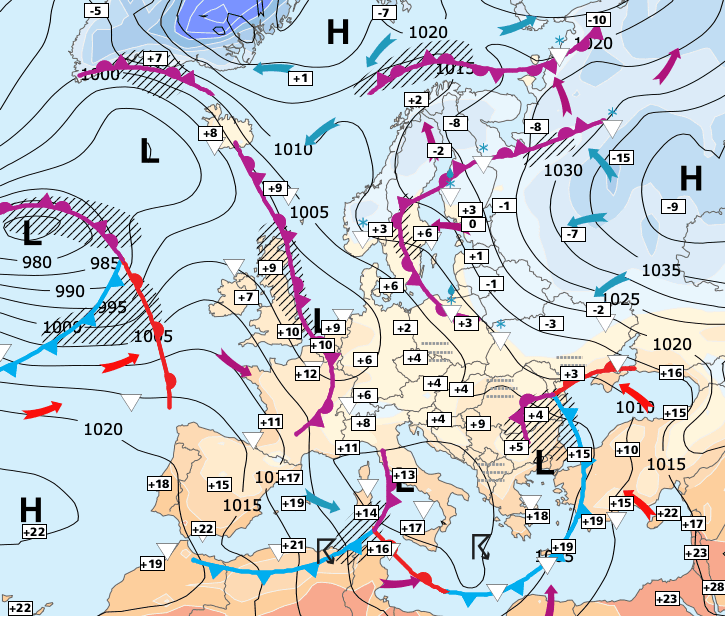 + A partir de maintenant, la France sera influencée par un courant de sud-ouest tantôt sec et calme, tantôt plus humide et plus agité (entre l’anticyclone de Europe continentale et le courant perturbé océanique).