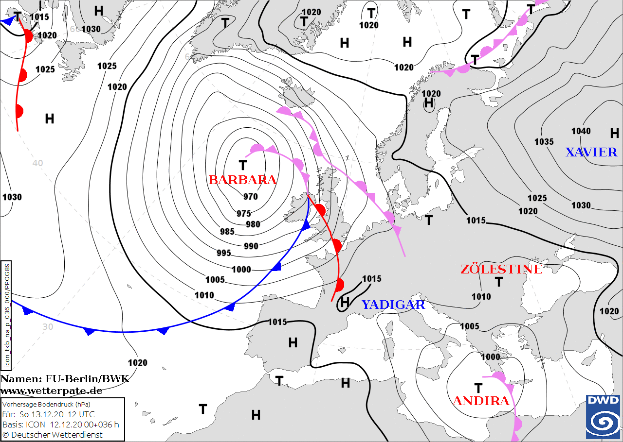 Noms des dépressions et anticyclones prévus pour dimanche 13 décembre 2020 à midi (Berlin)