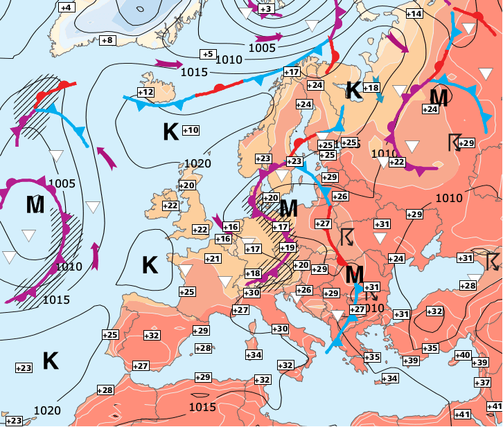 + Et ce conflit entre l'air océanique humide et relativement frais à l'Ouest, et les remontées sahariennes plus chaudes à l'Est va persister la semaine prochaine.