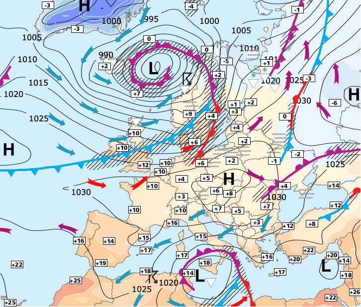 + A partir de mercredi, les hautes pressions se décaleront vers l'Europe centrale et le courant du sud apportera davantage de douceur.