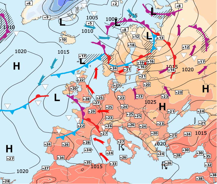 + Nous sommes désormais influencés par une dépression située sur l’Atlantique qui nous envoie de l’air plus instable et un peu moins chaud - ce conflit occasionne des orages parfois forts qui ne quitteront véritablement la France qu’en fin de semaine.