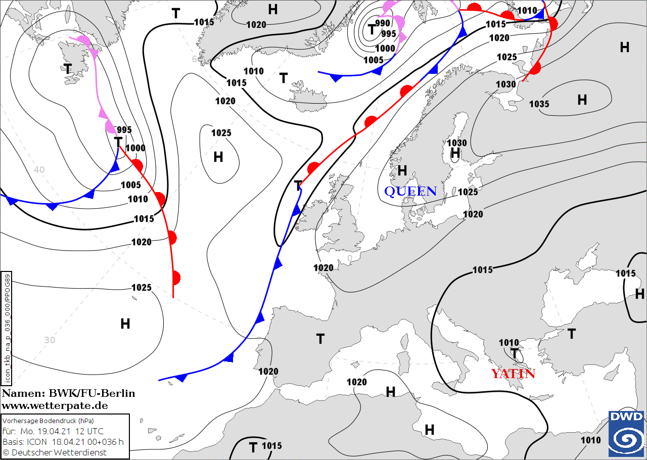 Noms des dépressions et anticyclones prévus pour lundi 19 avril 2021 à midi (Berlin)
