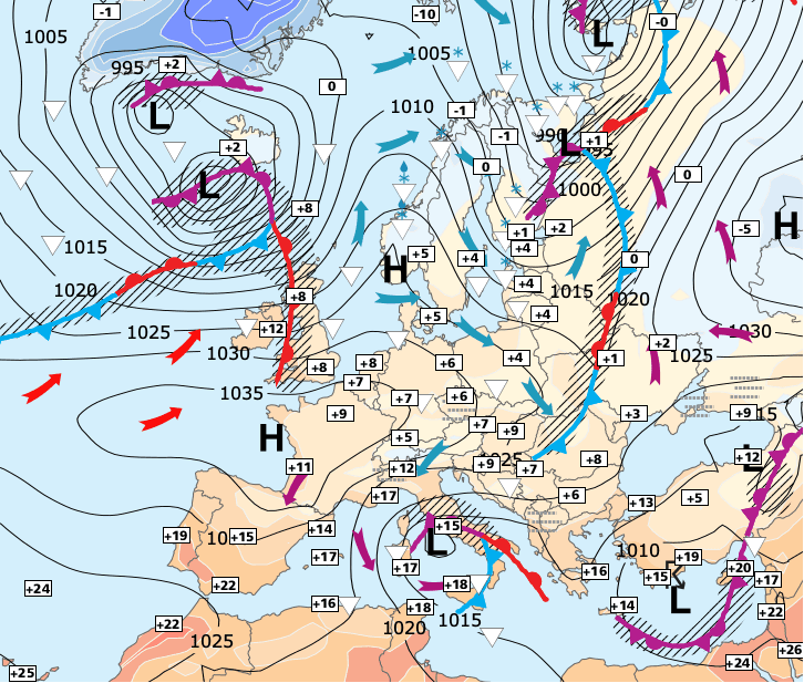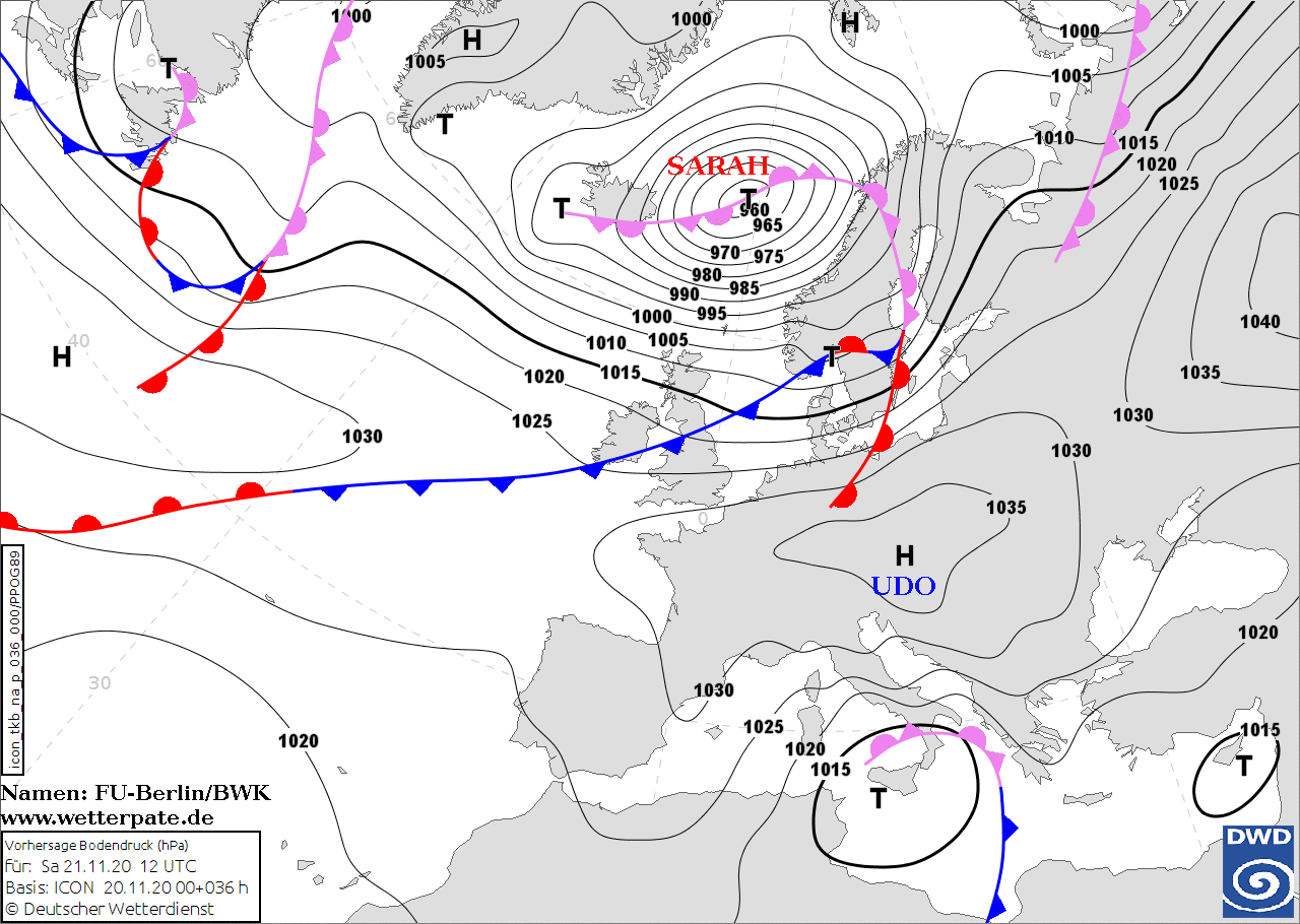 Noms des dépressions et anticyclones prévus pour samedi 21 novembre 2020 à midi (Berlin)
