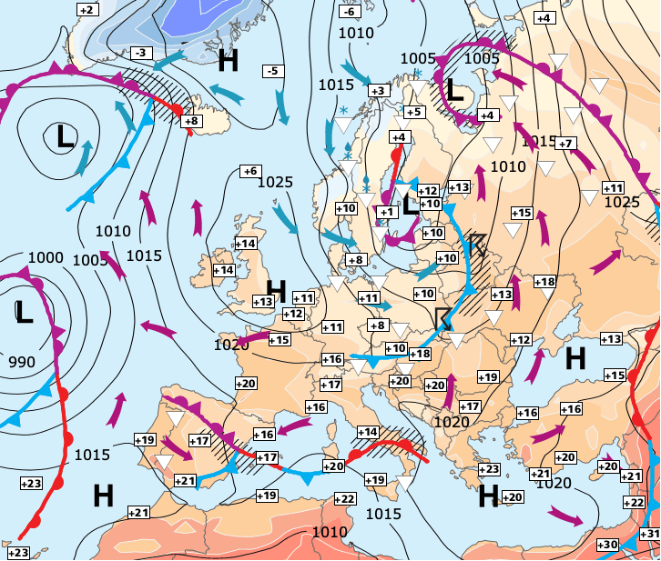 + Un nouvel anticyclone britannique étend son influence sur l'Europe occidentale et le temps redevient plus stable sur toute la France.