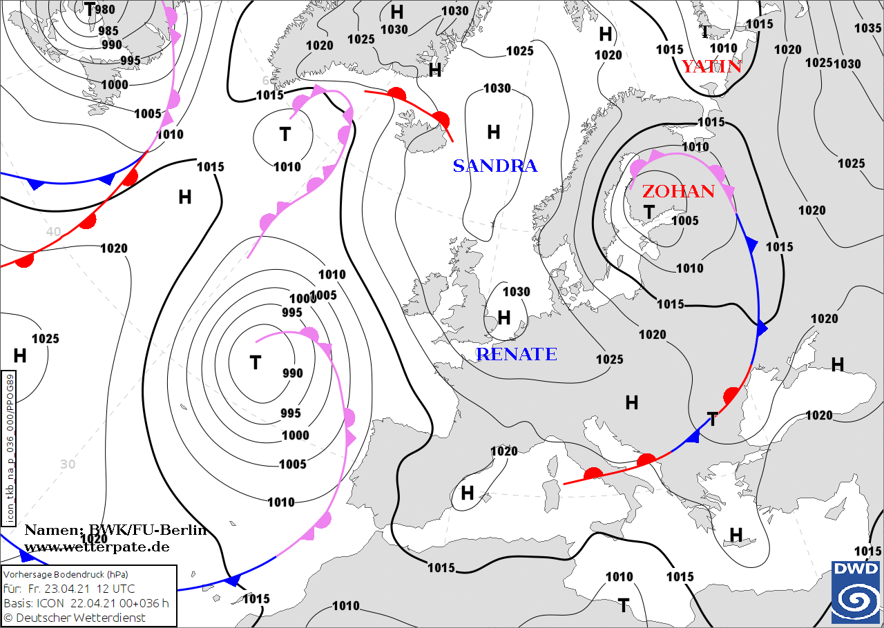 Noms des dépressions et anticyclones prévus pour vendredi 23 avril 2021 à midi (Berlin)