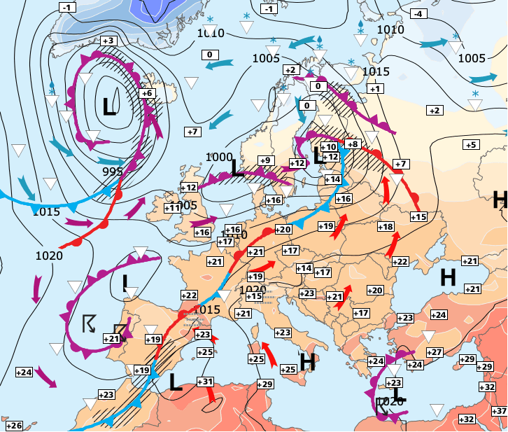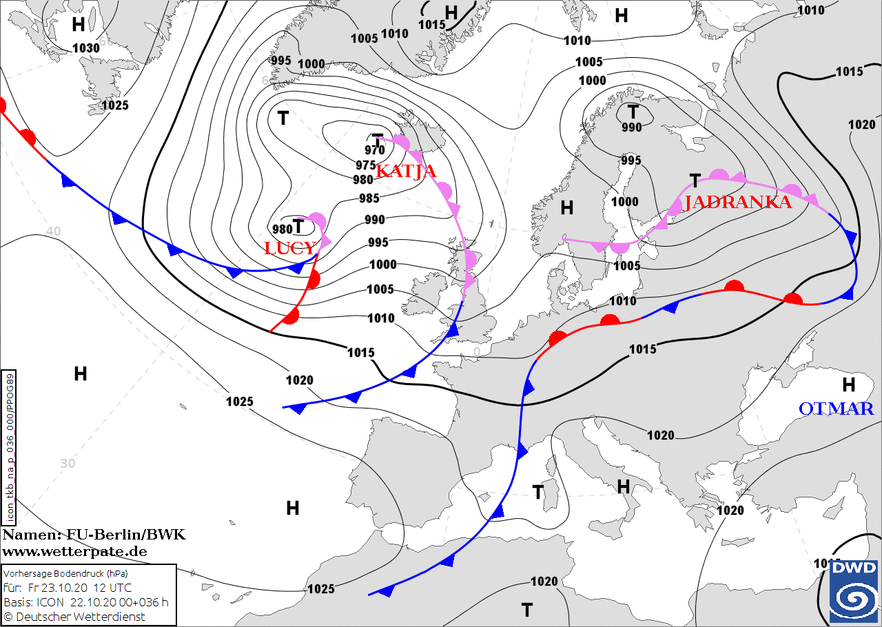 Noms des dépressions et anticyclones prévus pour vendredi 23 octobre 2020 à midi (Berlin)