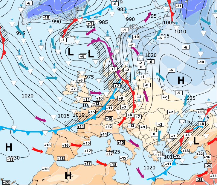 + A partir de dimanche, le courant basculera au nord-ouest et l’anticyclone remontera lentement vers les îles britanniques.