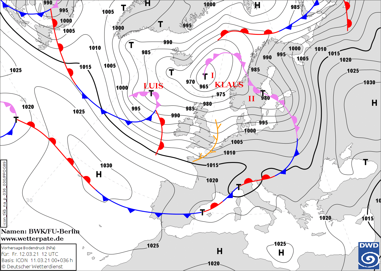 Noms des dépressions et anticyclones prévus pour vendredi 12 mars 2021 à midi (Berlin)