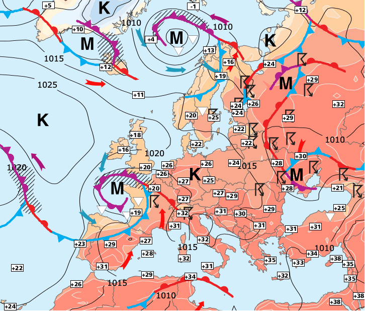 Noms des dépressions et anticyclones prévus pour lundi 28 juin 2021 à midi (Berlin)