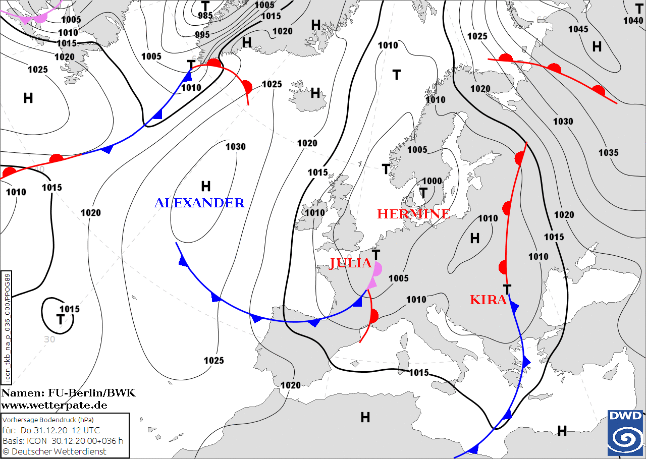 Noms des dépressions et anticyclones prévus pour jeudi 31 décembre 2020 à midi (Berlin)