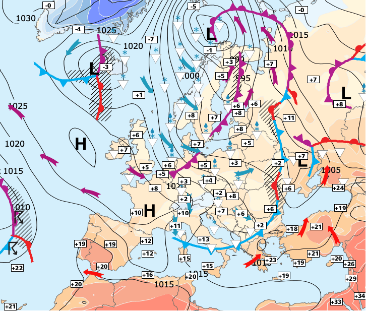 + Vendredi, l’anticyclone se décalera vers le Sud-est de l’Europe, et le courant perturbé océanique pourra s'imposer, occasionnant les premières ondées par le Nord-ouest et le Sud-ouest de la France (où la première vague orageuse de la saison pourrait se former au contact de l'air chaud).