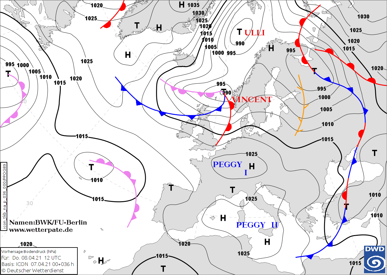 Noms des dépressions et anticyclones prévus pour jeudi 8 avril 2021 à midi (Berlin)