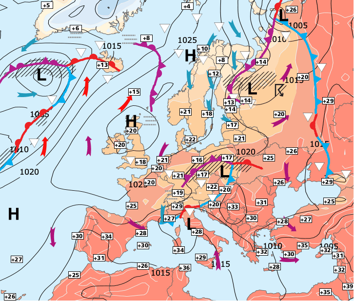 + Cet anticyclone devrait nous accompagner au moins jusqu’au début du mois de septembre, maintenant un temps sec et stable.