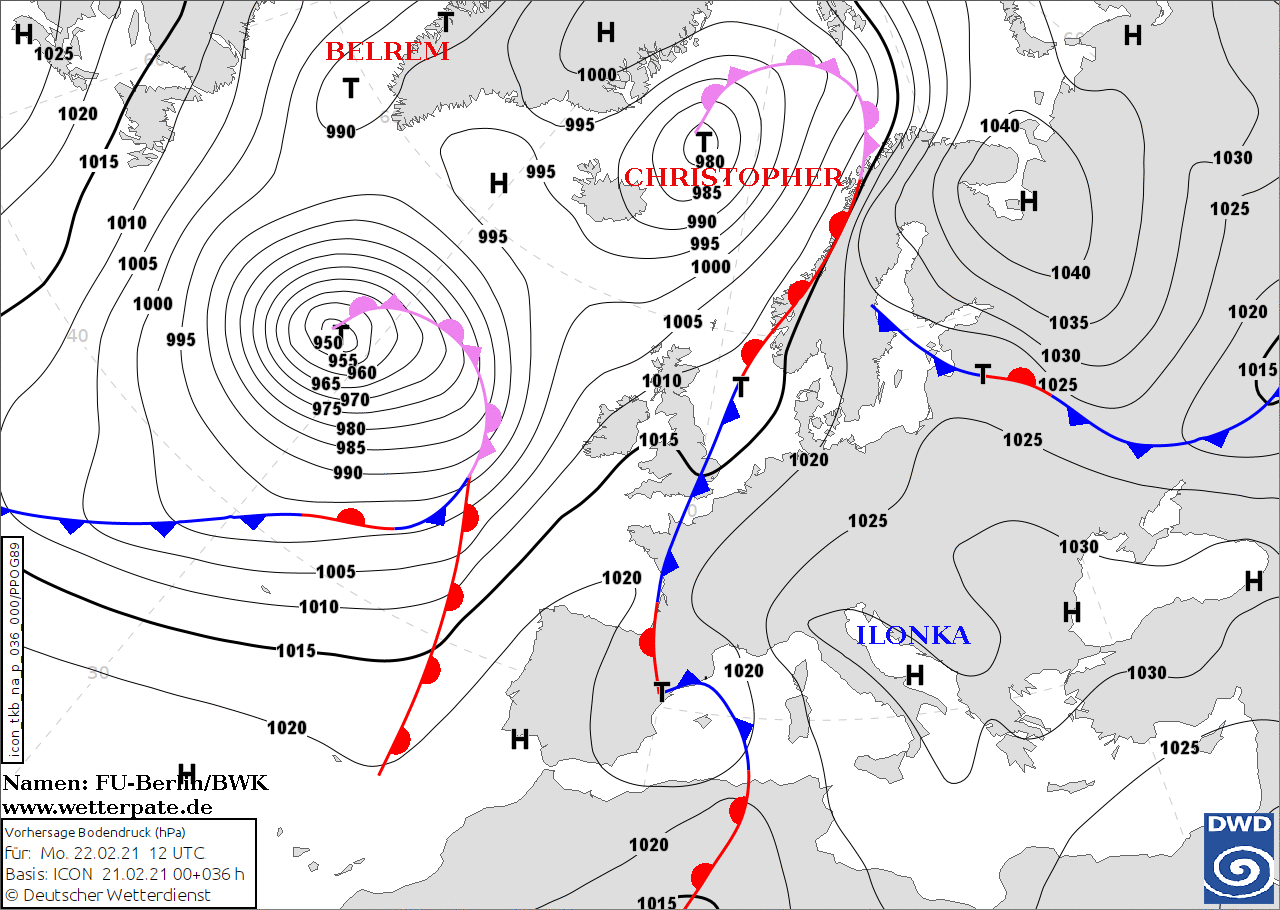 Noms des dépressions et anticyclones prévus pour lundi 22 février 2021 à midi (Berlin)