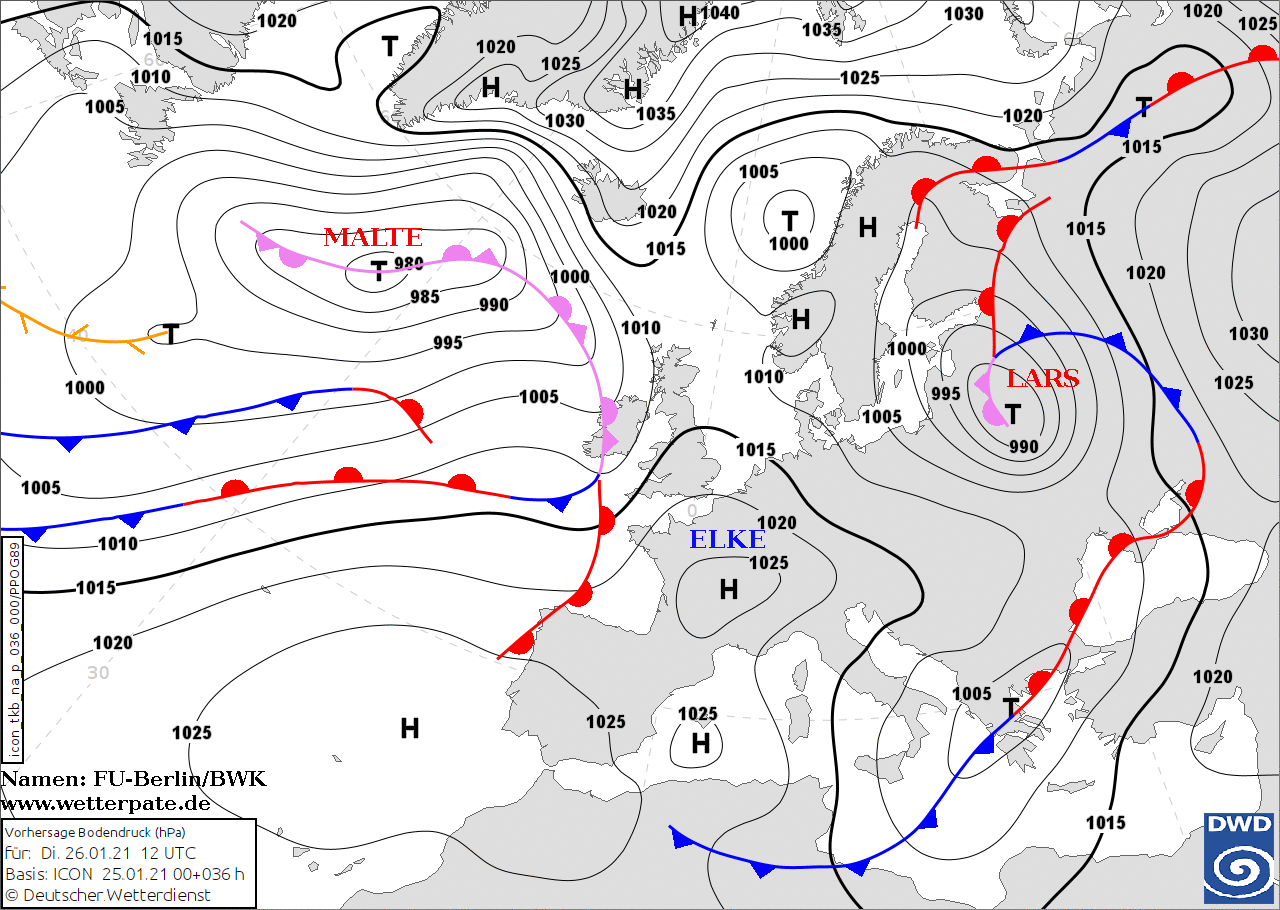 Noms des dépressions et anticyclones prévus pour mardi 26 janvier 2021 à midi (Berlin)
