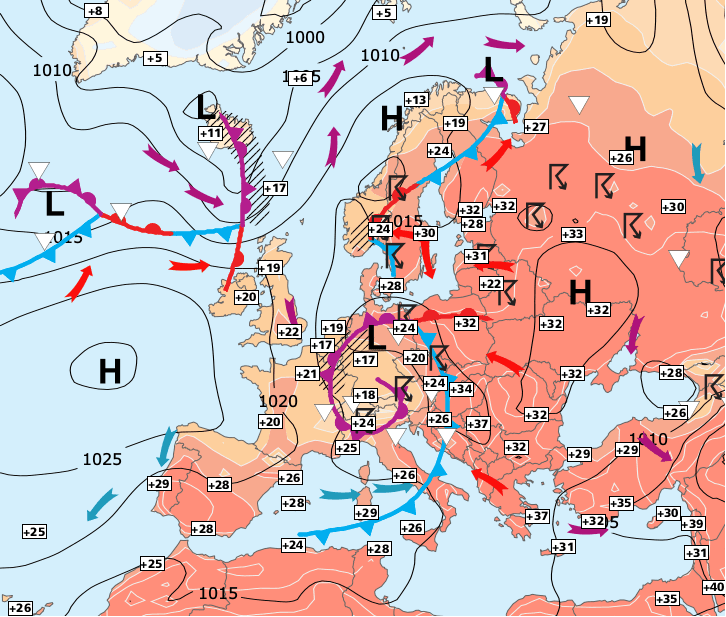 Noms des dépressions et anticyclones prévus pour jeudi 15 juillet 2021 à midi (Berlin)