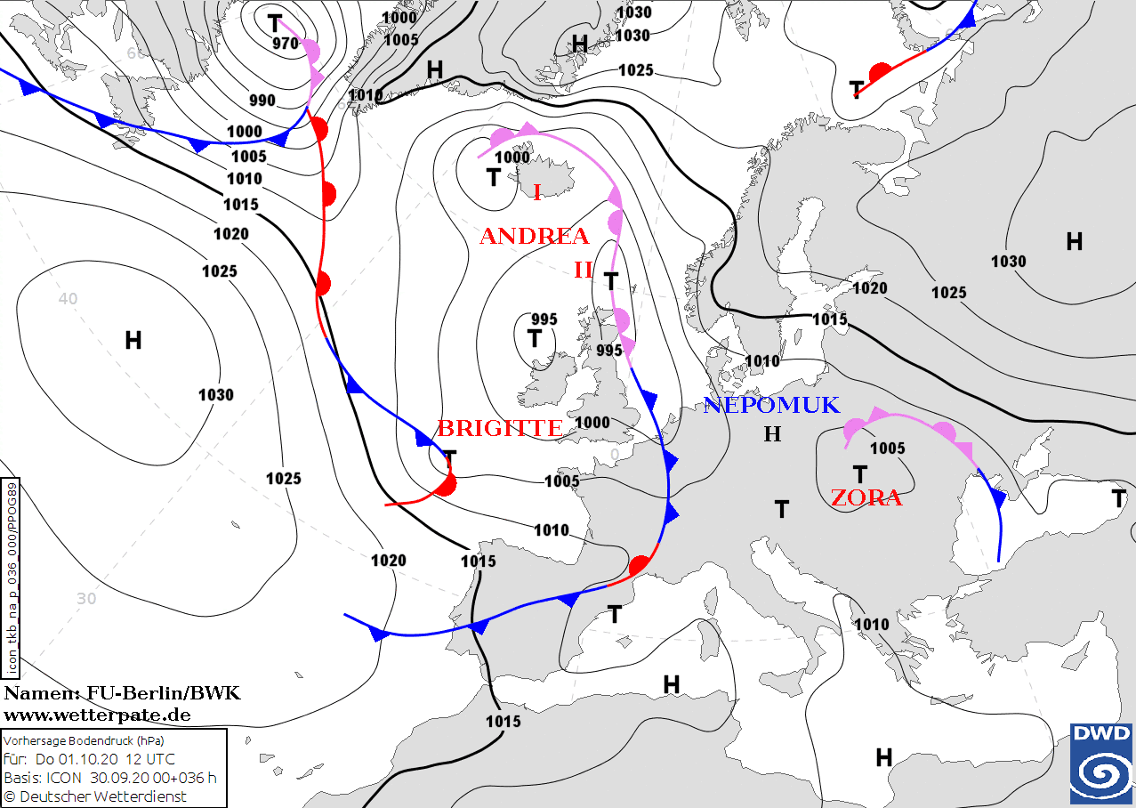 Noms des dépressions et anticyclones prévus pour jeudi 1er octobre 2020 à midi (Berlin)