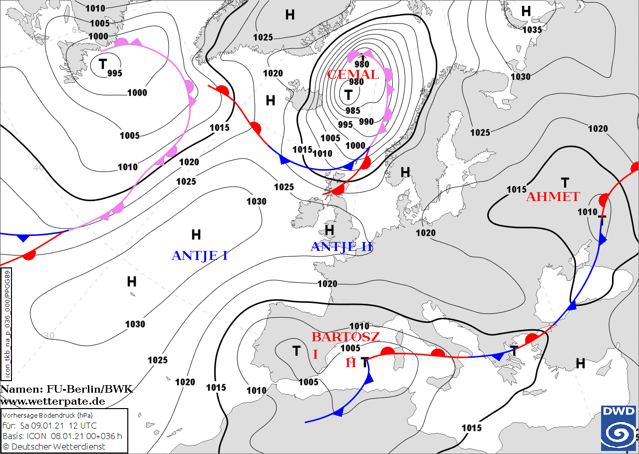 Noms des dépressions et anticyclones prévus pour samedi 9 janvier 2021 à midi (Berlin)