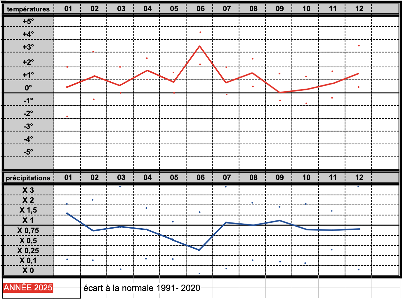 Climat, météo et écarts à la normale des températures et des pluies mensuelles au cours de l'année 2025